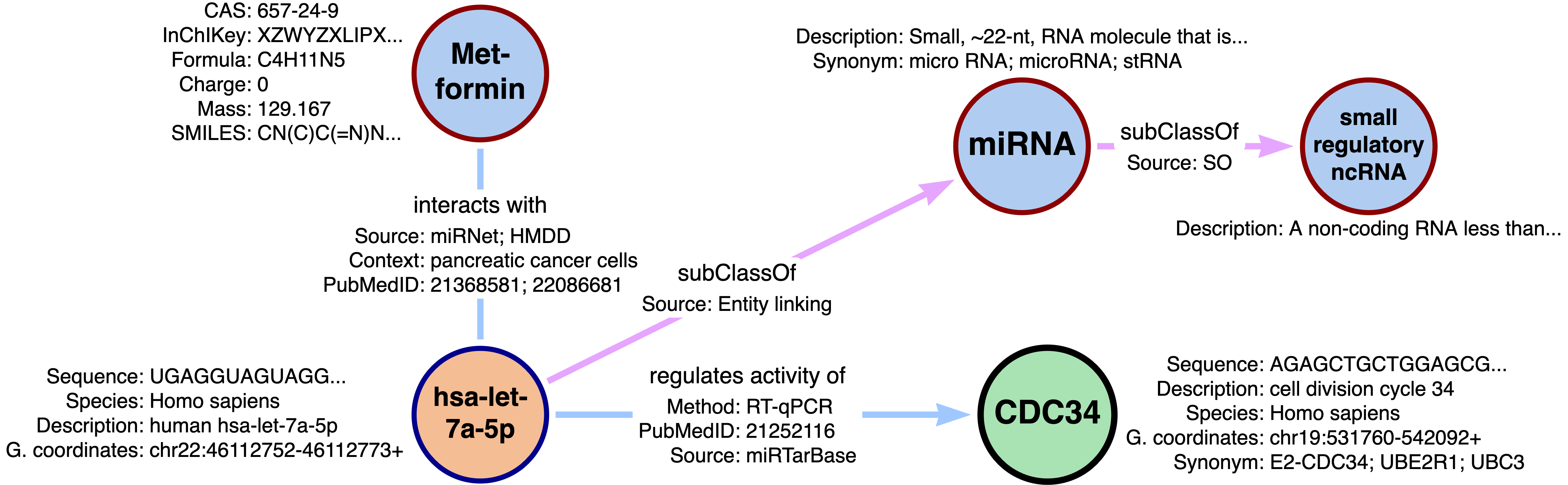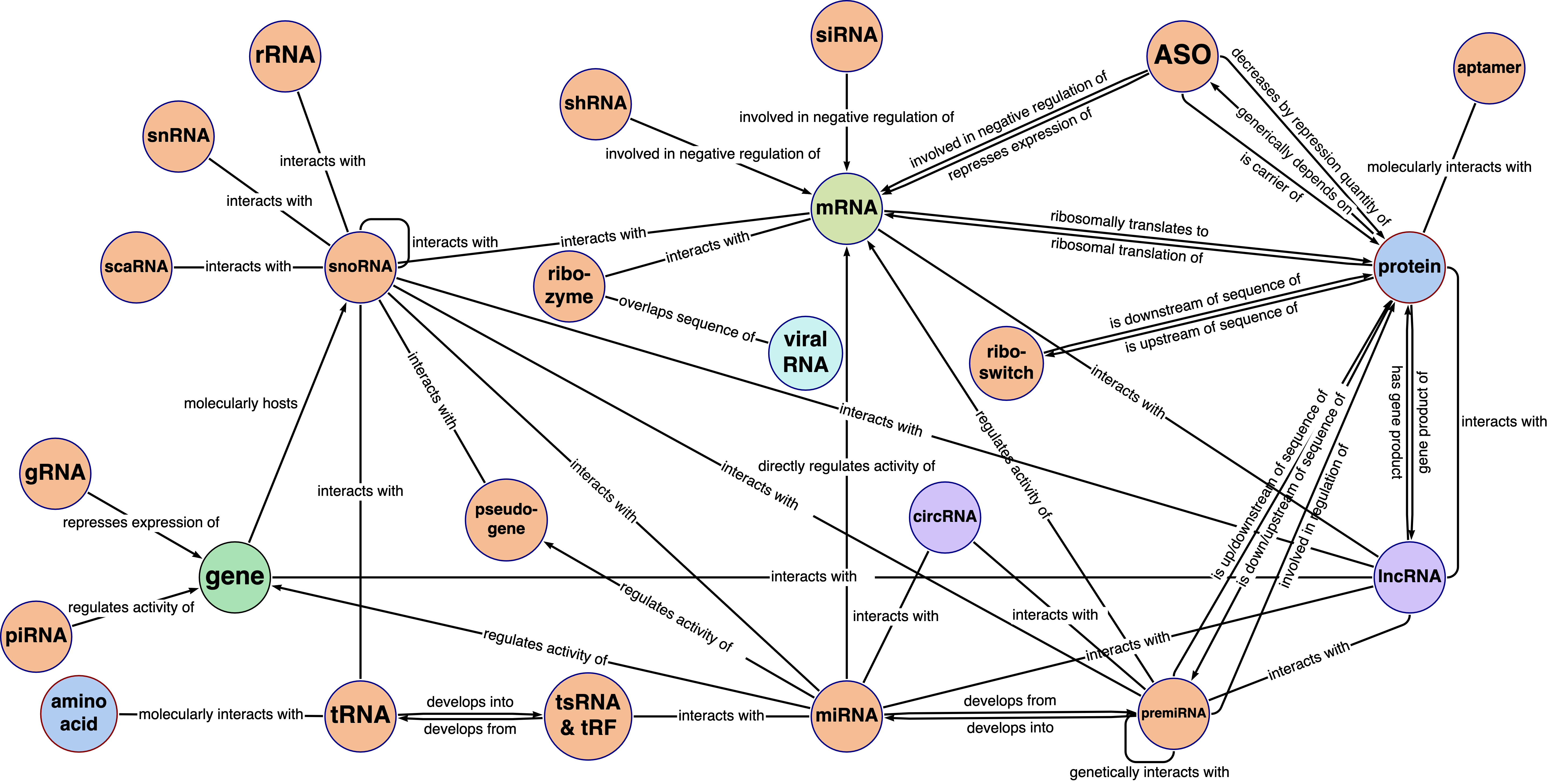 RNA-KG Logo RNA-KG v2.0 is an ontology-based knowledge graph which encompasses biological knowledge about RNA molecules gathered from more than 90 linked open data sources and ontologies, integrating functional relationships with genes, proteins, and chemicals and ontologically grounded biomedical concepts. Relationships are characterized by standardized properties that capture the specific context (e.g., cell line, tissue, pathological state) in which they have been identified. In addition, the nodes are enriched with detailed attributes, such as descriptions, synonyms, and molecular sequences sourced from platforms such as OBO ontologies, NCBI repositories, RNAcentral, and Ensembl. RNA-KG is constantly maintained and updated with new experimental data and is a core project of the Monarch Initiative KG-Hub and an RNAcentral expert database. More details can be found in our pre-print.